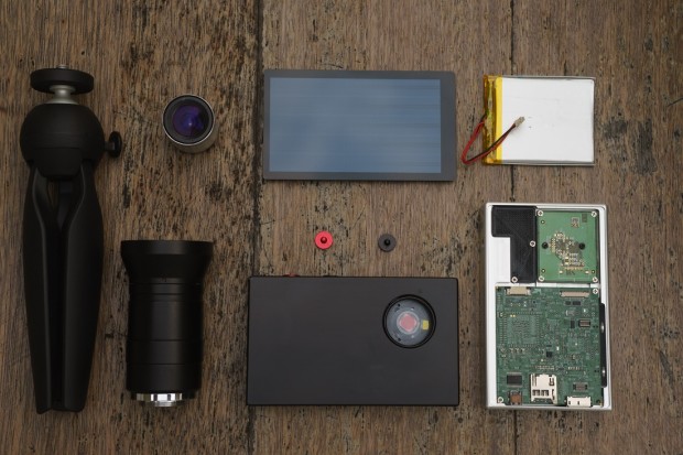 Layout of the Tiny1 system. From the left: Mini Tripod, 100mm F2, 4mm F1.2 kit lens, touch screen module, black anodized edition, assorted shutter buttons, battery, version 1 motherboard.